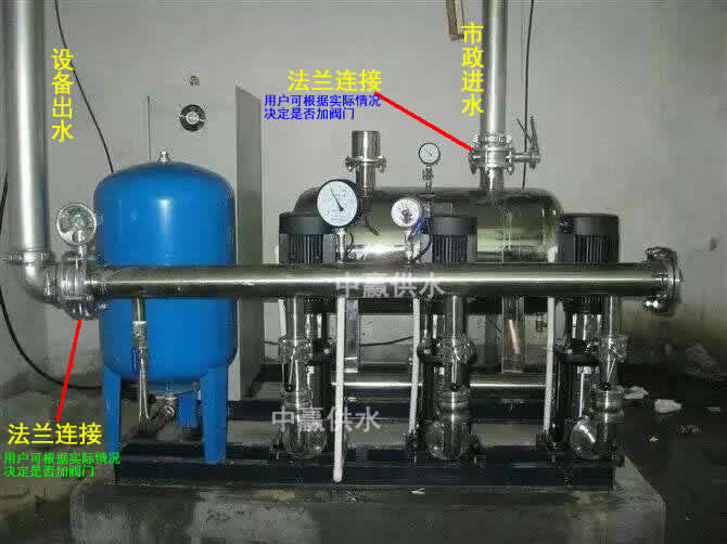 2, water: non negative pressure water supply equipment inlet at non negative pressure steady flow tank, so in the docking, docking to the municipal network over the non negative pressure steady flow tank flange can be.